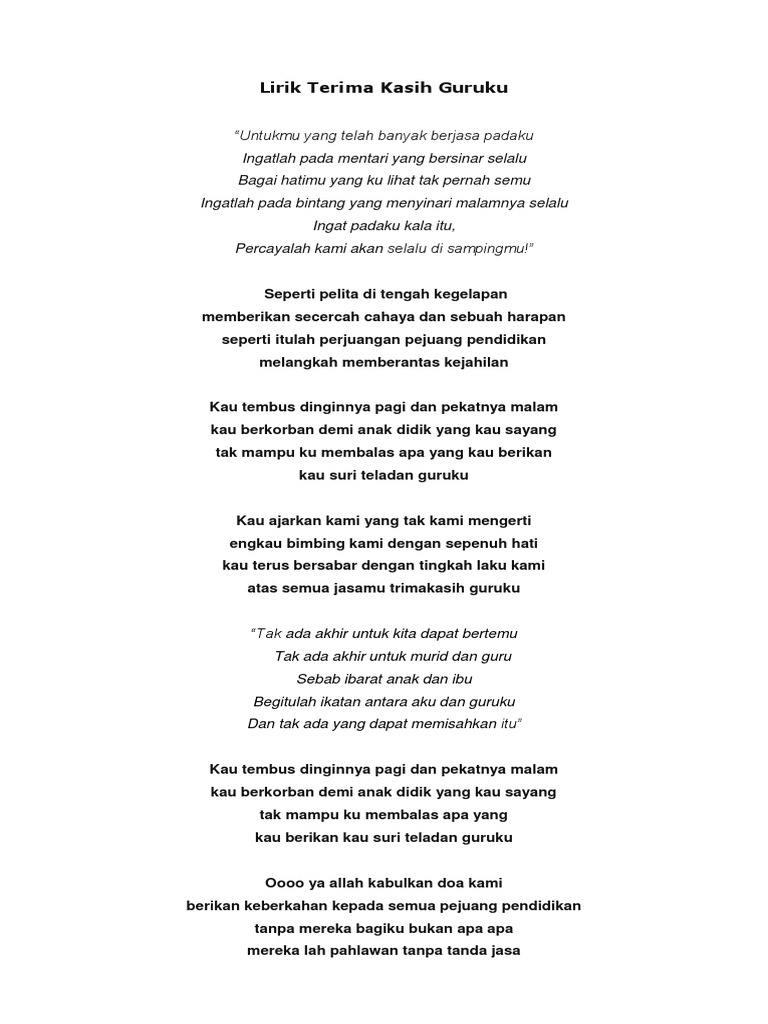 Lirik Lagu Terima Kasihku ciptaan Ibu sud 0332 485 MB 151154. Ingatlah pada mentari yang bersinar. Lirik lagu dari Puisi Ena Voice yang berjudul Terima Kasih Guruku.
